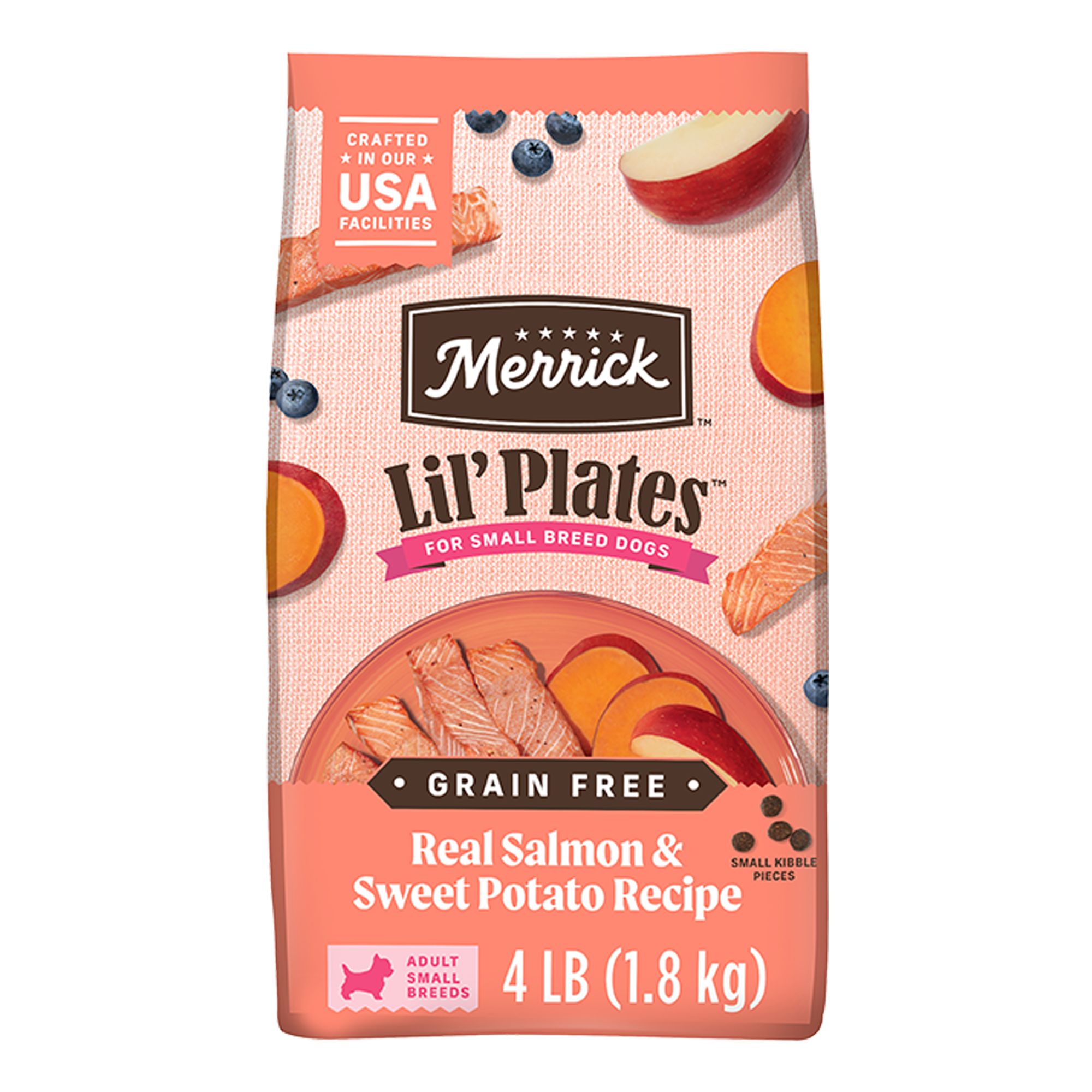 Serve your little dog food they will love with Merrick Lil' Plates Dog Food, Real Texas Beef And Sweet Potato Recipe. Real deboned beef is the first ingredient in this natural, with added vitamins, minerals, and nutrients recipe, a high protein adult dog food that helps your small breed dog maintain lean muscle mass and healthy energy levels. This grain free dry dog food is crafted specifically for small dogs and contains a delicious, crunchy texture and smaller sized kibble to fit smaller sized mouths. High levels of Omega-6 and Omega-3 fatty acids nourish your small dog's skin and coat in this premium dry dog food for small dogs, as well as high levels of glucosamine and chondroitin to support healthy hips and joints. Wholesome ingredients are prioritized in this grain free dry dog food that is made without corn, wheat, and soy, or artificial flavors or preservatives. Merrick dog food recipes are proudly founded in Hereford, Texas, crafted in USA facilities.