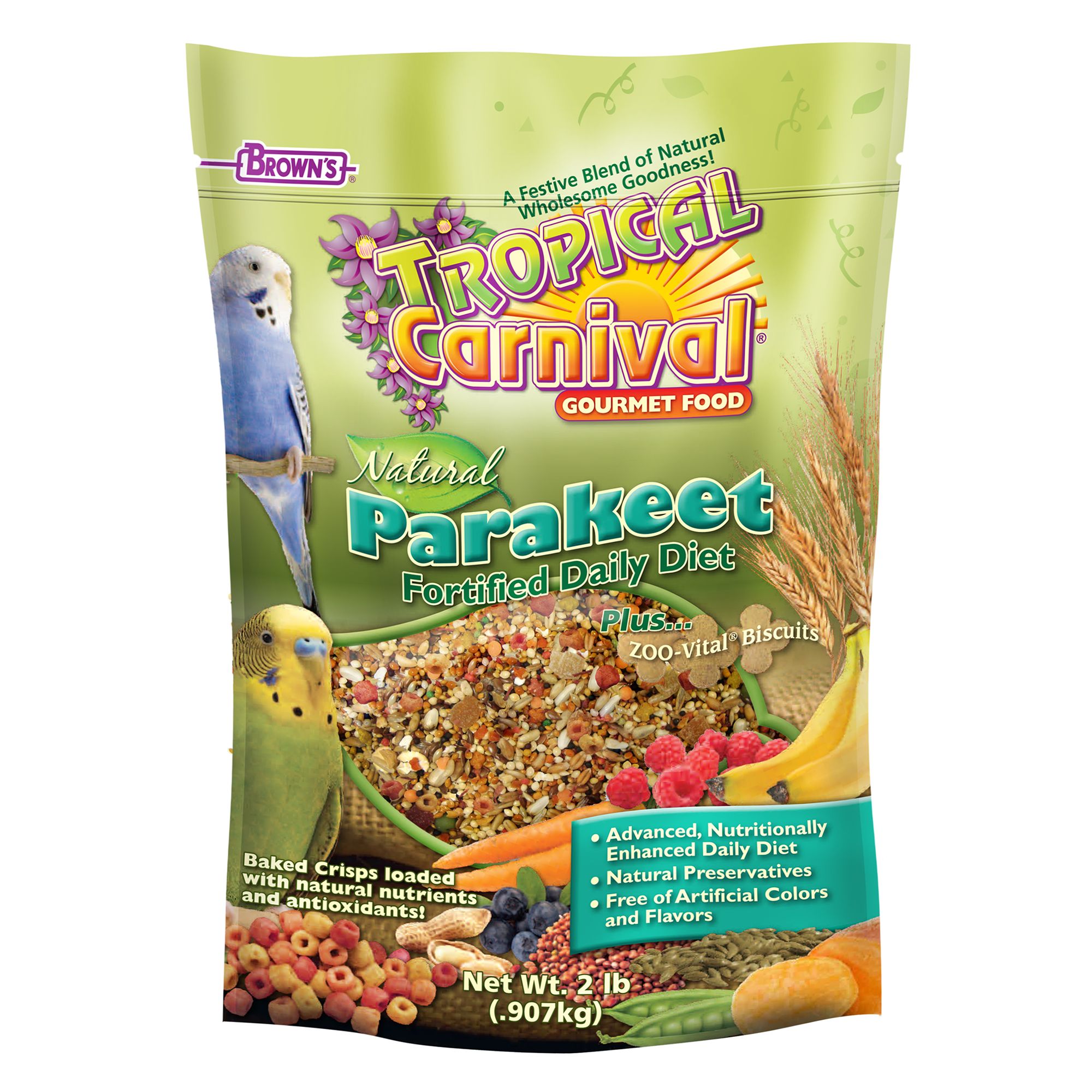 Striped Sunflower Seeds, Safflower Seeds, Canary Seed, White Proso Millet, Oat Groats, Peanuts, Almonds, Flaxseed, Dried Pineapple, Dried Papaya, Pumpkin Seeds, Wheat, Buckwheat, Flaked Peas, Dried Carrots, Dried Dates, Dried Sweet Potato, Dried Strawberry, Dried Red Chili Peppers, Wheat Flour, Vegetable Oil, Ground Corn, Ground Oats, Corn Gluten Meal, Dehulled Soybean Meal, Rice Flour, Dehydrated Ground Raspberry, Dehydrated Ground Blueberry, Dehydrated Ground Strawberry, Dehydrated Ground Peach, Dehydrated Ground Apple, Dehydrated Ground Pineapple, Dehydrated Ground Banana, Dehydrated Ground Carrot, Dehydrated Ground Sweet Potato, Soybean Oil (preserved with Mixed Tocopherols), Dicalcium Phosphate, Brewers Dried Yeast, Calcium Carbonate, Salmon Oil (Source of DHA & Omega 3 Fatty Acids), Fructooligosaccharide, L-Lysine, Salt, Vitamin A Supplement, Vitamin D3 Supplement, Vitamin E Supplement, L-Ascorbyl-2-Polyphosphate (Source of Vitamin C), Thiamine Mononitrate, d-Calcium Pantothenate, Vitamin B12 Supplement, Choline Chloride, Manganese Proteinate, Iron Proteinate, DL-Methionine, Zinc Proteinate, Sodium Selenite, Dried Pediococcus acidilactici Fermentation Product, Biotin, Folic Acid, Lecithin, Mixed Tocopherols (a preservative), Yucca Schidigera Extract, Rosemary Extract, Beta-Carotene