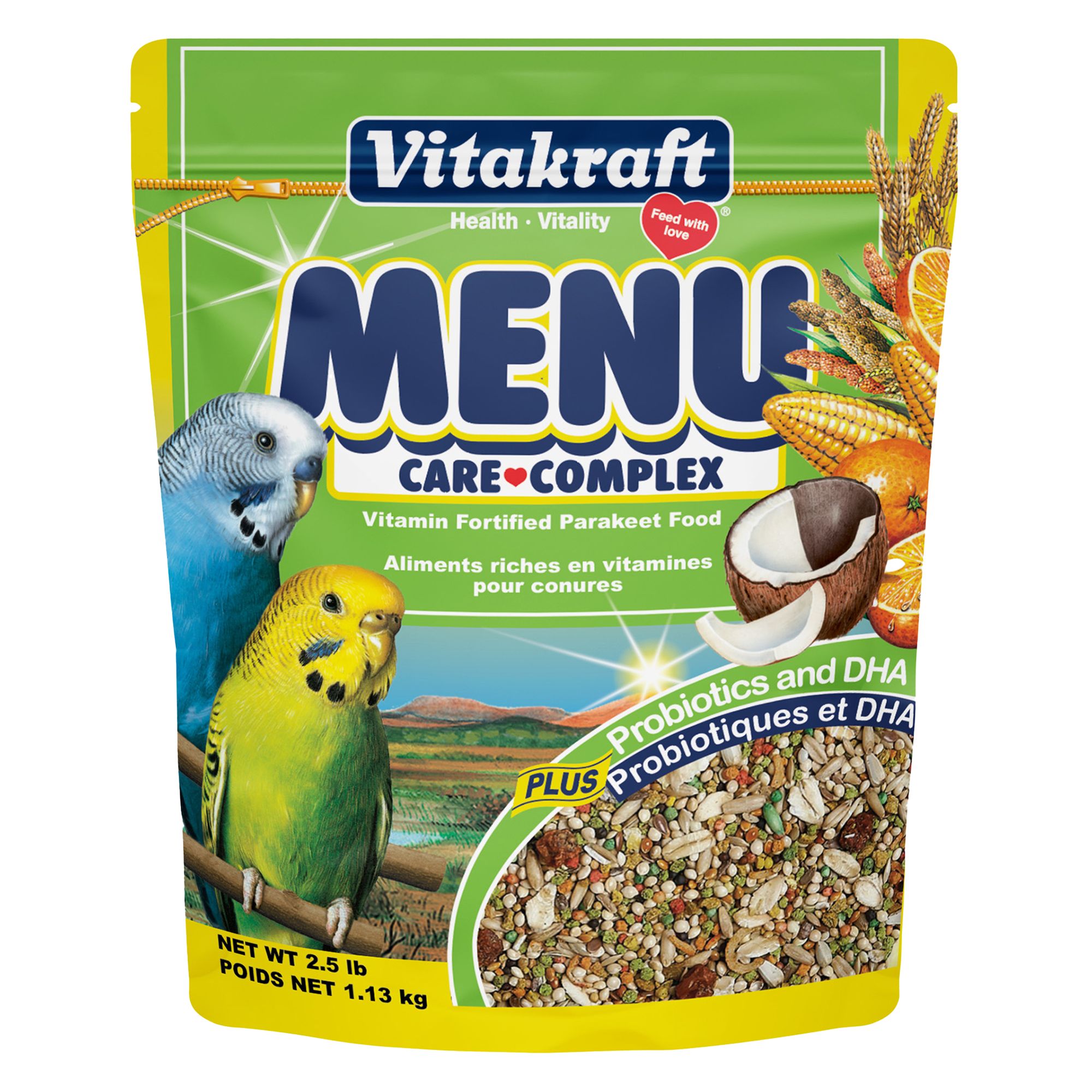 White Proso Millet, Red Millet, Canary Seed, Flax Seed, Yellow Millet, Small Red Millet, Oat Groats, Canola Seed, Safflower Seed, Wheat, Peanuts, Cranberry Seed, Lentils, Split Green Peas, Brown Rice, Wheat Flour, Ground Corn, Ground Oats, Corn Gluten Meal, Dehulled Soybean Meal, Rice Flour, Dehydrated Ground Raspberry, Dehydrated Ground Blueberry, Dehydrated Ground Strawberry, Dehydrated Ground Peach, Dehydrated Ground Apple, Dehydrated Ground Pineapple, Dehydrated Ground Banana, Dehydrated Ground Carrot, Dehydrated Sweet Potato, Soybean Oil, Dicalcium Phosphate, Brewers Dried Yeast, Calcium Carbonate, Algae Meal, Fructooligosaccharide, L-Lysine, Salt, Vitamin A Supplement, Vitamin D3 Supplement, Vitamin E Supplement, L-Ascorbyl-2-Polyphosphate, Thiamine Mononitrate, Menadione Sodium Bisulfite Complex, Vitamin B12 Supplement, Magnesium Sulfate, Potassium Sulfate, Calcium Iodate, Choline Chloride, Manganese Proteinate, Iron Proteinate, Cobalt Carbonate, Copper Sulfate, DL-Methionine, Zinc Proteinate, Sodium Selenite, Dried Bacillus Subtilis Fermentation Product, Dried Aspergillus Oryzae Fermentation Product, Dried Lactobacillus Acidophilus Fermentation Product, Dried Lactobacillus Casei Fermentation Product, Dried Bifidobacterium Thermophilum Fermentation Product, Dried Enterococcus Faecium Fermentation Product, Dried Aspergillus Niger Fermentation Product, Biotin, Folic Acid, Lecithin, Mixed Tocopherols(a Preservative), Yucca Schidigera Extract, Rosemary and Carotene