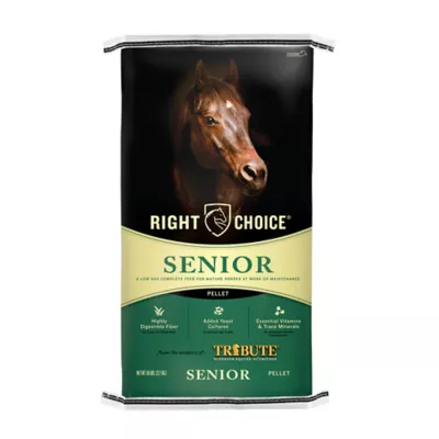 Right Choice Senior Horse Feed Pellets are a low NSC complete feed for mature horses at work or maintenance. These pellets also work to support gut health.