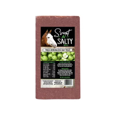 Sweet N Salty Apple Salt Brick for Horses is an apple-flavored trace mineralized salt treat for horses. These treats support proper hydration.