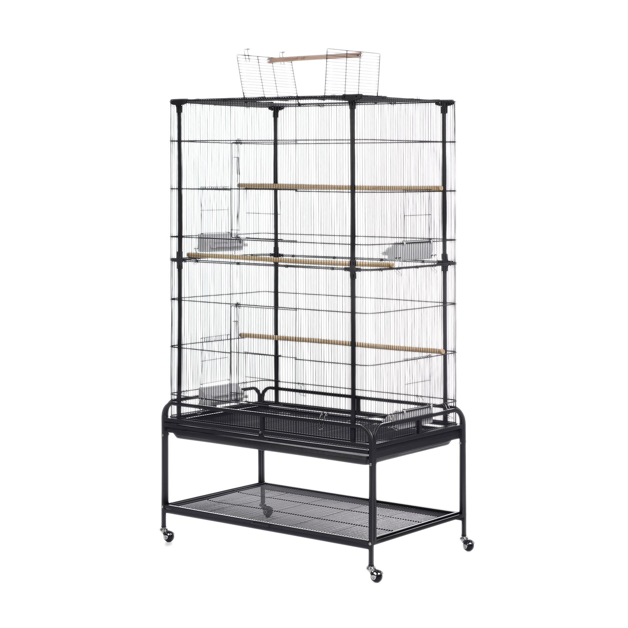 Features: A great showcase for your birds! Large powder–coated steel construction flight cage for multiple small birds. One large hinged front access door and two small side access⁄cup doors. Pull–out grille and debris tray for easy cleaning. Cage stand base features integrated storage shelf and easy–rolling casters. Easy to assemble. Ideal for canaries, parakeets and other small to medium size birds. 31 in L x 20.5 in W x 59.25 in H
