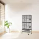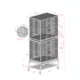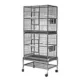 Features: 2 separate units to hold multiple birds. Bird proof front door & feeder door locks. Vertical bars. Slide–out grill & tray. 2 large front doors for easy access. 2 breeder doors. 4 easy rolling casters. Bottom shelf for storage. Non–toxic, durable and safe powder coated finish
