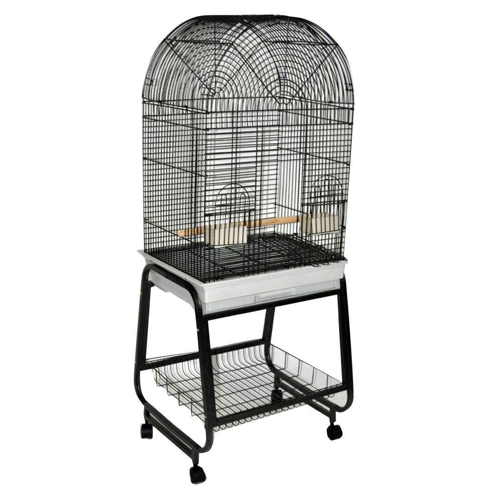 Bird proof front door & feeder door locksPlay top with 2 ladders, perch, & toy hookHorizontal side bars, vertical bars front & backFront door safety latch3 swing out feeder doors3 stainless steel feeder cups & perchLarge front door for easy accessRemovable seed catcherSlide-out tray underneath play top keeping cage mess freeSlide-out grill & tray for easy cleaningNon-toxic, durable and safe powder coated finishInterior Height: 29"Bar Spacing: 5/8"Weight: 77 lbs.Exterior Dimensions: 24"x22"x62"