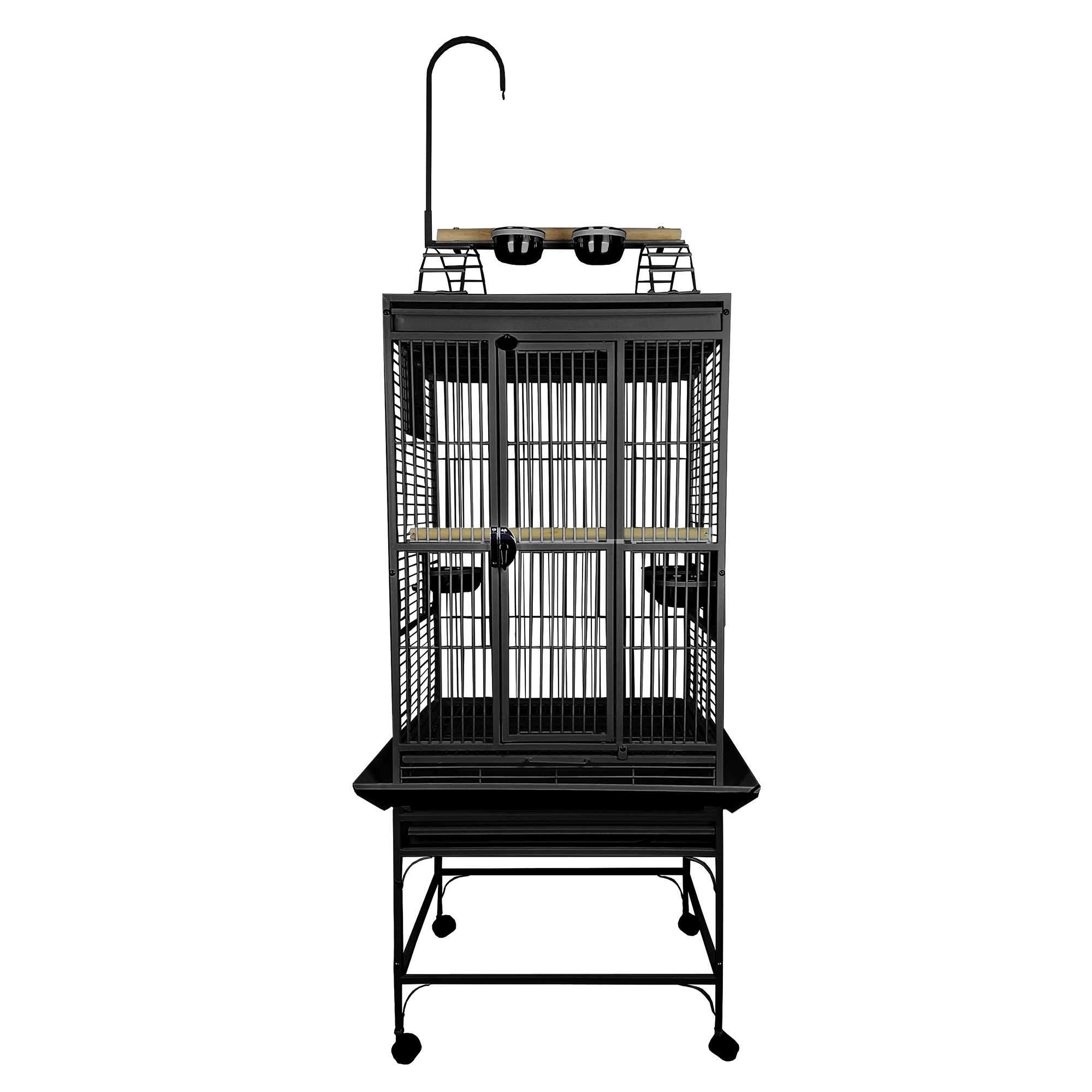 Large front door that folds down to also serve as a perch for your bird and includes a front door safety latchBird cage top opens into play topHorizontal side bars