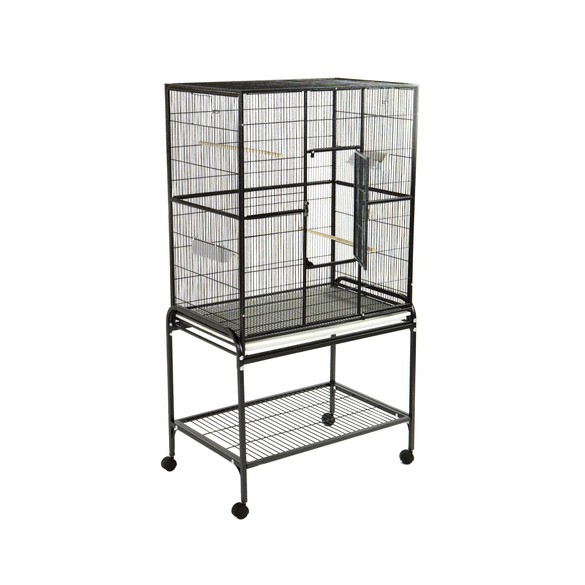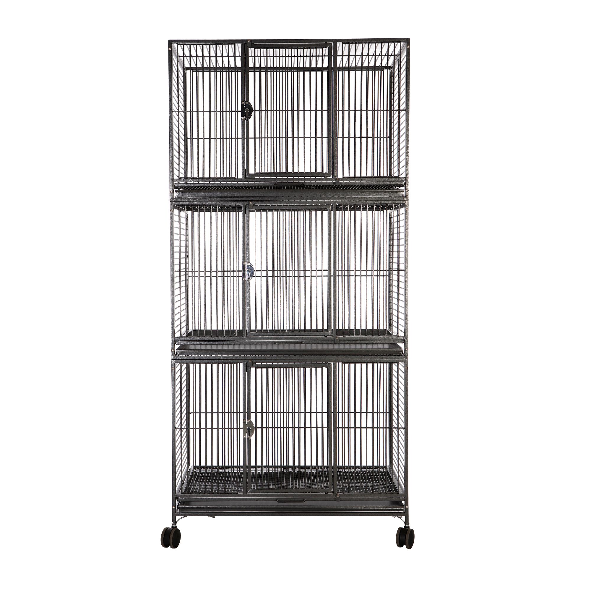 Features: Configurable up to 6 separate units to hold multiple birds. Large central door on each cage. Small swing–out front doors. Removable grates and trays for easy cleaning. 12 feeder doors. 4 easy rolling casters. Non–toxic, durable and safe powder coated finish