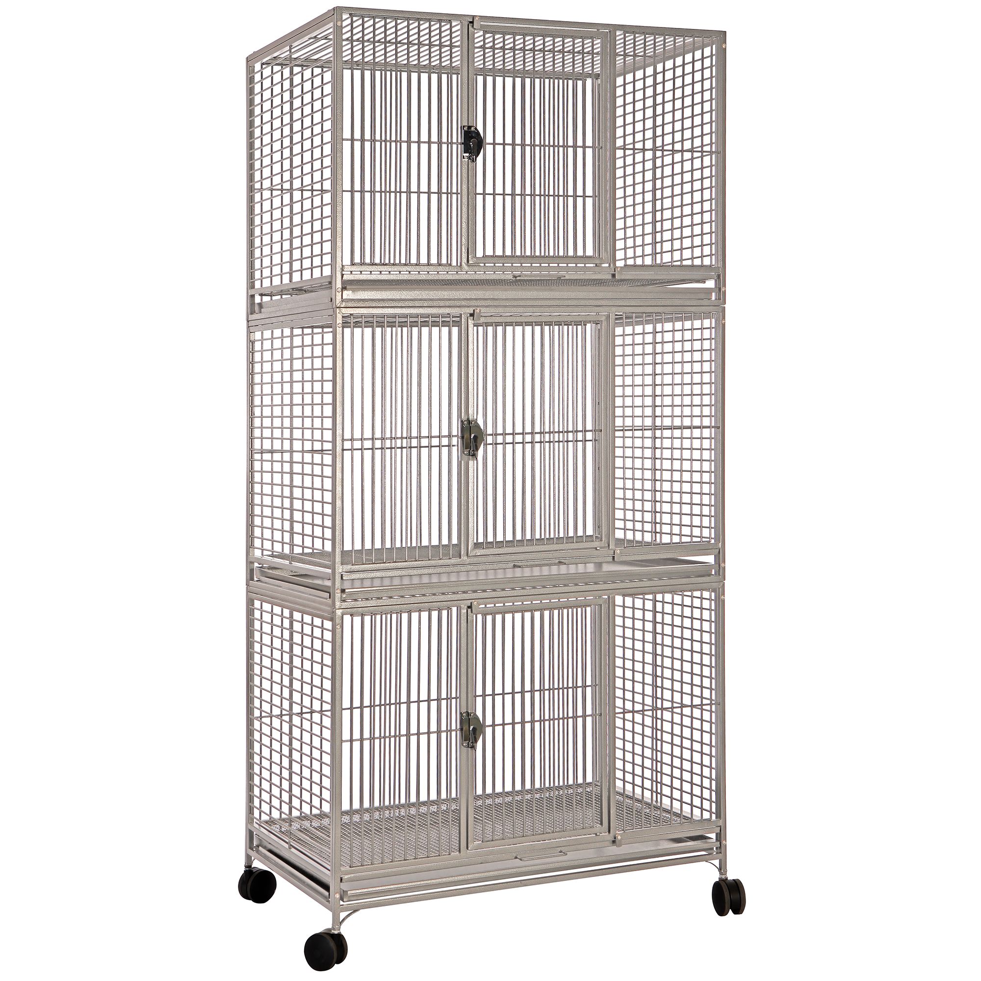 Features: 3 separate units to hold multiple birds. Bird proof front door and front foor safety latch. 3 slide out grills & trays. Horizontal side bars, vertical bars front & back. 3 large front doors for easy access. 6 swing out feeder doors. 3 breeder door boxes. 6 stainless steel feeder cups. 3 perches. 4 easy rolling casters. Non–toxic, durable and safe powder coated finish.