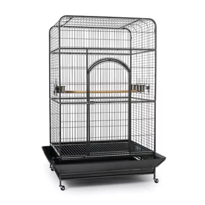 Prevue Pet Products Empire Macaw Cage 3157 is one of the largest cages on the market. The roomy square top design gives even the largest bird plenty of space to play and explore. Cage assembles easily with slip in mesh panel construction and flathead hex bolts that can not be unscrewed by birds. Cage stand base features easy rolling casters and the interior floor grille can be removed to add 10" of additional living space. Pull out bottom grille and tray make cleaning easy, while rounded corner seed guards keep your floors clean too. Included with this extra large bird cage are three stainless steel, non-tip, bowls and one hardwood perch, 1-1/8" in diameter. Our Empire Macaw Cage 3157 is available exclusively in an attractive Black Hammertone finish.