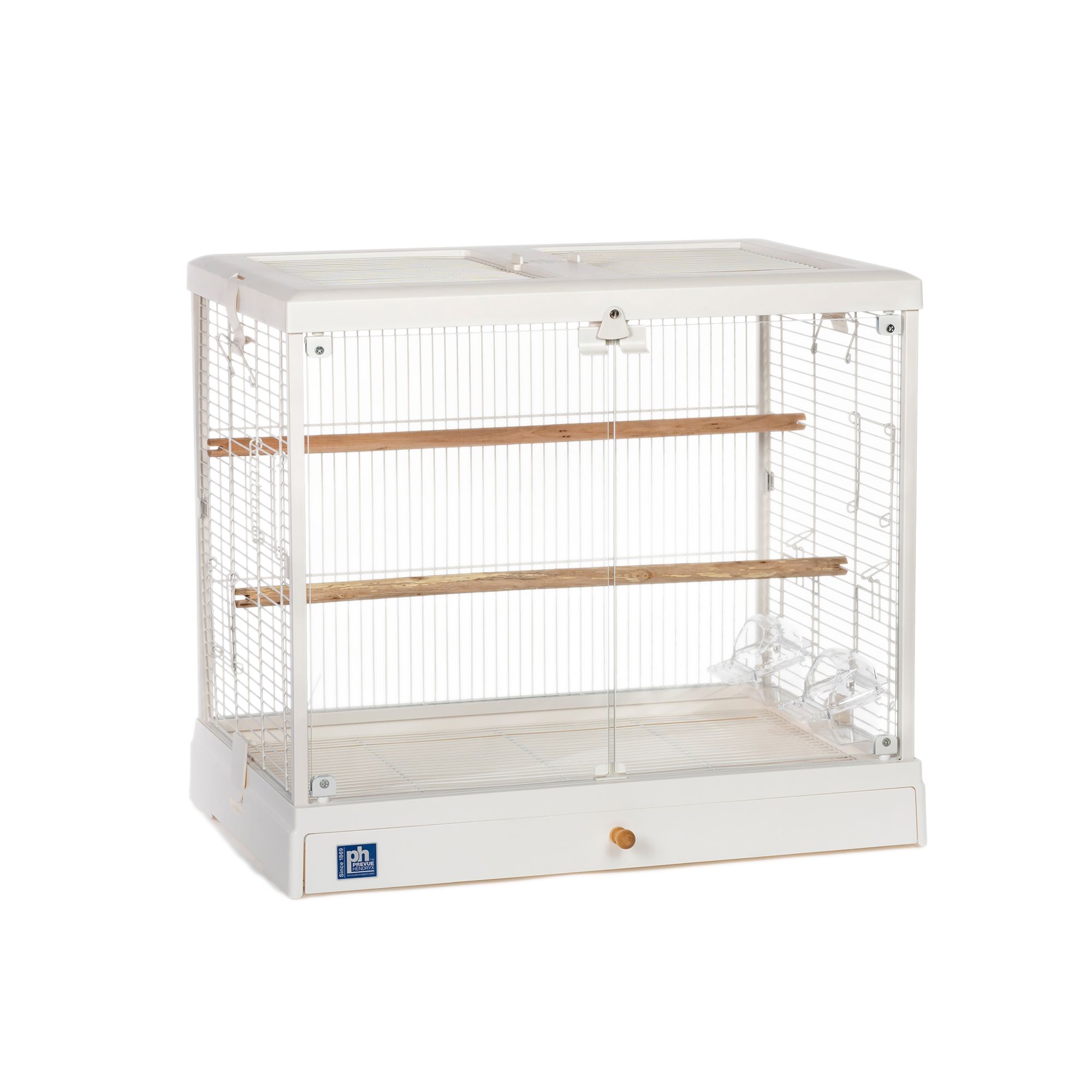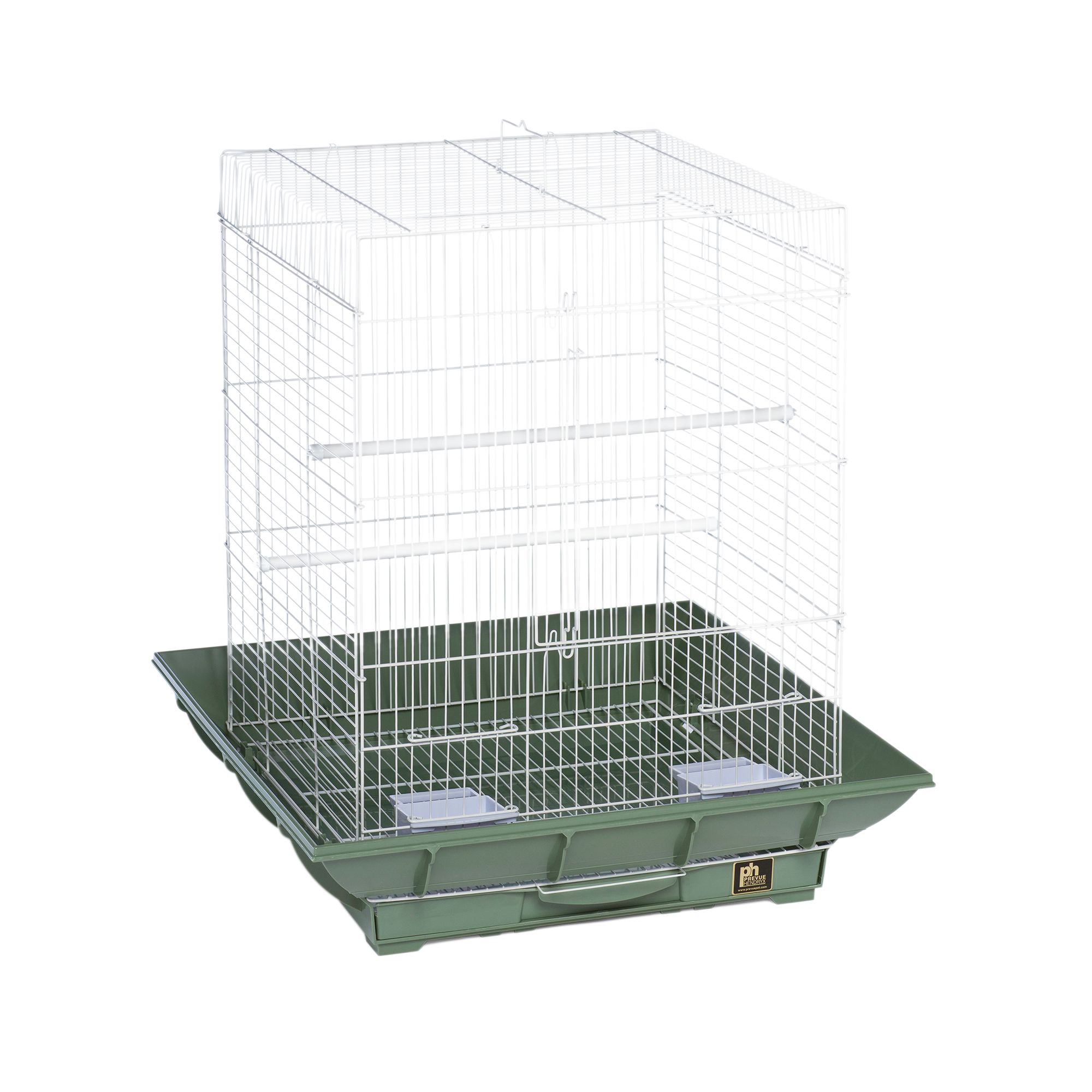 Description: Prevue Pet Products Sonata Bird Home 31994 is an elegant home for your small bird. Ample living space provides plenty of room for activity toys. Attractive finial and translucent base add to the airy aesthetic of this modern take on a traditional bird cage design. One large front door and 2 cup doors provide access to the cage while the split–tray debris base lets you clean up easily. 2 food⁄water cups, 1 swing and 1 perch are included. Expertly designed in the USA, all Prevue cages undergo independent lab testing to conform to the highest levels of pet safety. Perfect for a tabletop or on a hanging stand, our Sonata Bird Home measures 19'' in diameter at the widest point and 23