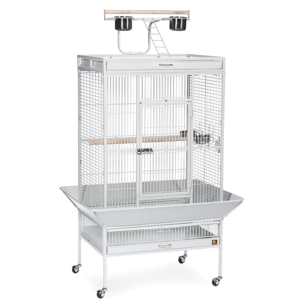 Constructed of wrought iron with a cage top playstand to keep your bird entertained and content, the heavy-duty push button lock keeps your bird securely inside its cage when playtime is over. This select bird cage also includes four stainless steel cups, two wood perches and a castered stand for portability. Both trays and bottom grille are removable for ease of cleaning while the rounded corner seed guards control mess around the cage. Our Wrought Iron Select Cage measures 24 inches long, 20 inches wide, 60 inches high with 3/4" wire spacing.