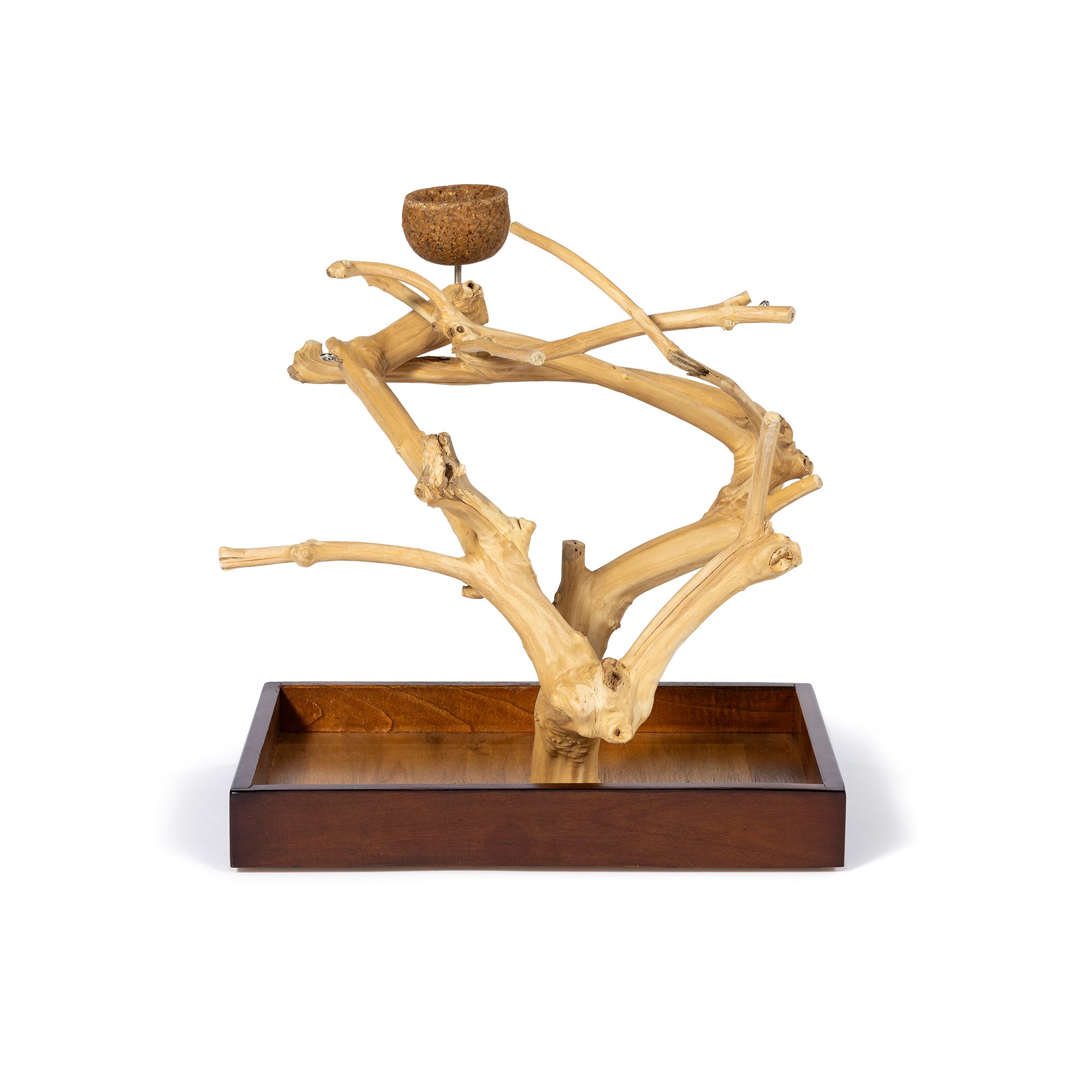 Prevue Pet Products Coffeawood Java Tree Minis X-Large Table Top Playstand 22636 is a sustainably harvested, 100% natural wood product from the Coffeawood/Java tree. Allow your bird to play and explore as it would in the forest by climbing and perching among the gnarled branches. Each Minis tabletop playstand has multiple levels and is a unique and one-of-a-kind product, no two trees are alike! With a thicker branch diameter, our X-Large Model is perfect for medium and large sized birds like cockatiel, caique, Amazon and smaller Macaw. Coffeawood trees are a sustainable resource from coffee/java trees that are no longer productive. Photos are representative of the tree style, but are not the actual trees to be purchased. All Coffeawood/Java Trees are natural and unique. Variations in actual items purchased should be expected. Natural materials have natural variations, any minor cracks, natural wood folds and other variations do not constitute defects. Minor assembly required, attach the trunk to the base, using the outline as a guide. Do not tighten food/water bowls all the way down to the branches.
