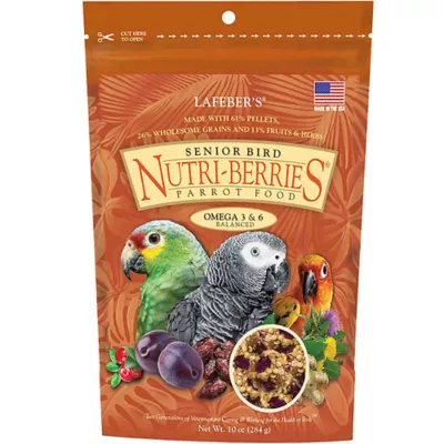 Optimize your senior bird's diet with Senior Bird Nutri-Berries. Senior Nutri-Berries are a nutritionally complete food for senior Amazon parrots, African Greys, or similarly sized parrots. Veterinarian-formulated with 61% pellets, 26% wholesome grains, and 13% fruits and herbs. Age-combative ingredients include milk thistle, dandelion, and ginger, and whole pieces of age-defying fruits like plums, cranberries, and dates. Like people, age-related conditions like arthritis can happen at different ages for different birds. In general, a bird may be considered a senior once he or she reaches half of their expected life span.