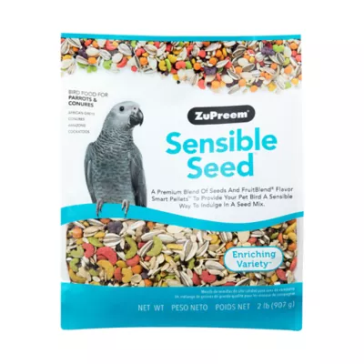 DescriptionFeed your bird a premium blend of seeds and FruitBlend Flavor Smart Pellets with ZuPreem Sensible Seed Enriching Variety Mix for Parrots and Conures. This blend is made with only 10% sunflower seeds, and features right-sized pieces for African Greys, Conures, Amazons, Cockatoos and other Parrots and Conures that prefer this food size, which helps to minimize wasted food.