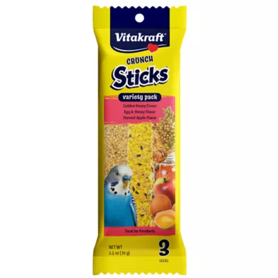 Vitakraft Crunch Sticks triple-baked layered treats are a great way to reward your favorite pet and come with a natural wood chew center to promote chewing and beak health long after the treat part is gone. This variety pack includes 3 different delicious Crunch Stick flavors for parakeets: Golden Honey, Egg & Honey, and Harvest Apple.