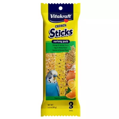 We put together three delicious parakeet Crunch Stick flavors for a delicious variety pack of crunchy goodness! Sticks included are Orange & Apricot, Egg & Honey, and Sesame & Banana. These triple-baked layered treat sticks are a great way to treat your favorite pet, with a natural wood chew center to promote chewing and beak health long after the treat part is gone.