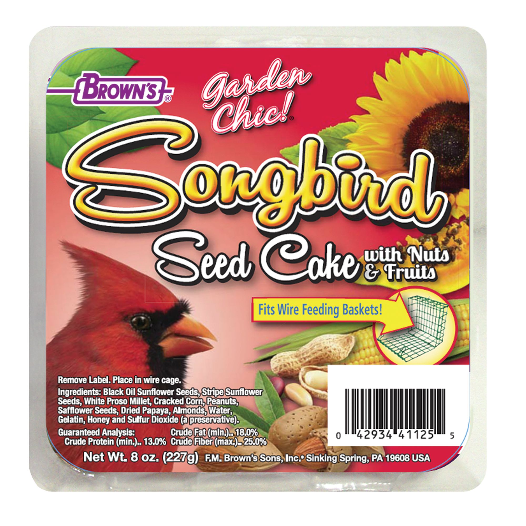 Brown's Garden Chic! Peanutty Suet Cakes are a favorite of woodpeckers, cardinals, and other songbirds. They're made with pure, fresh suet blended with millet, sunflower seeds, and jam-packed with peanuts, making them ideal for year-round feeding. Peanutty Suet Cakes fit into our easy-to-use wire feeding baskets to provide the fat and energy birds need to survive the hard winter months and nest in the spring.