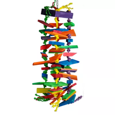 DESCRIPTION The Happy Beaks by A&E The Tremendous Chew Bird Toy is a great toy for birds that love to chew and play. Its multi-colored design with rope and wood blocks, makes it not only appealing, but durable. It easily hooks to the top of the cage for your bird to use.