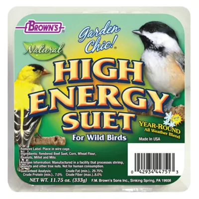 Brown's Garden Chic! High Energy Suet Cakes are made with pure, fresh suet blended with millet, sunflower seeds and peanuts, making them ideal for year-round feeding. Suet Cakes fit into our easy-to-use wire feeding baskets to provide the fat and energy birds need to survive the hard winter months and nest in the spring.