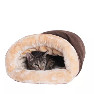 DESCRIPTION Your feline friend can tuck inside Armarkat's Model C15HKF/MH cat bed. This beige and mocha bed combines buttery faux suede and resilient faux fur.