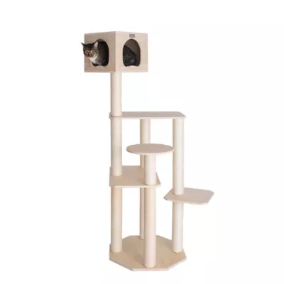 Multi-function Cat TowerEasy to clean and goes with furniture.Constructed of plywood veneers with original wood grain, polished surface, and natural Scots Pine scent.Features a lounge playhouse, big platform, plush hammock and sisal scratching posts for activity.Post Diameter: 3.5 in, Base Dimensions: 24 in x 23 in, Playhouse Dimensions: 14 in (L) x 14 in(W) x 12 in (H), Perch Dimensions: 18 in x 18 inMaximum Holding Weight: 70 lbs.180 Days Manufacturer Warranty.