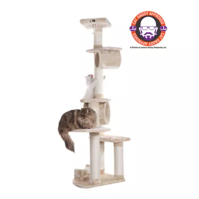 This Armarkat Cat Tree can be assembled two different ways! Cat Daddy approved by noted cat behaviorist Jackson Galaxy, this pressed wood tree features a hanging tunnel, hanging rope toy, multiple perches and 100% cured sisal scratching posts. Covered in beige faux-fur, it is easy to assemble with step-by-step instructions and tools.
