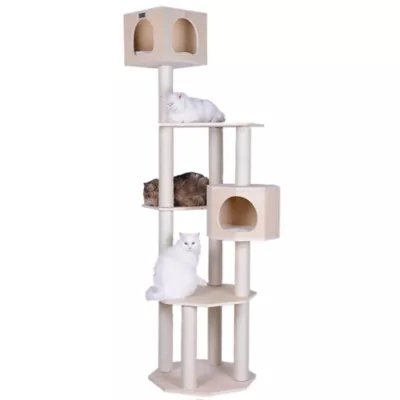 Multi-function Cat TowerEasy to clean and goes with furniture. Constructed of plywood veneers with original wood grain, polished surface, and natural Scots Pine scent.Features two spacious house, big platform and sisal scratching posts for activity.Double-layered base platforms for extra strength and superior balance, each with a comfortable place for your cat to rest and relax.Recommended to be placed near the window or in the corner, perfect for kitties/adult cats.Base Dimensions: 24 in x 19 in; Playhouse Dimensions: 14 in (L) x 14 in (W) x 12 in (H) and 16 in (L) x 16 in (W) x 12 in (H); Perch Dimensions: 18 in x 18 in, Diameter: 3.5 in.180 Days Manufacturer Warranty.