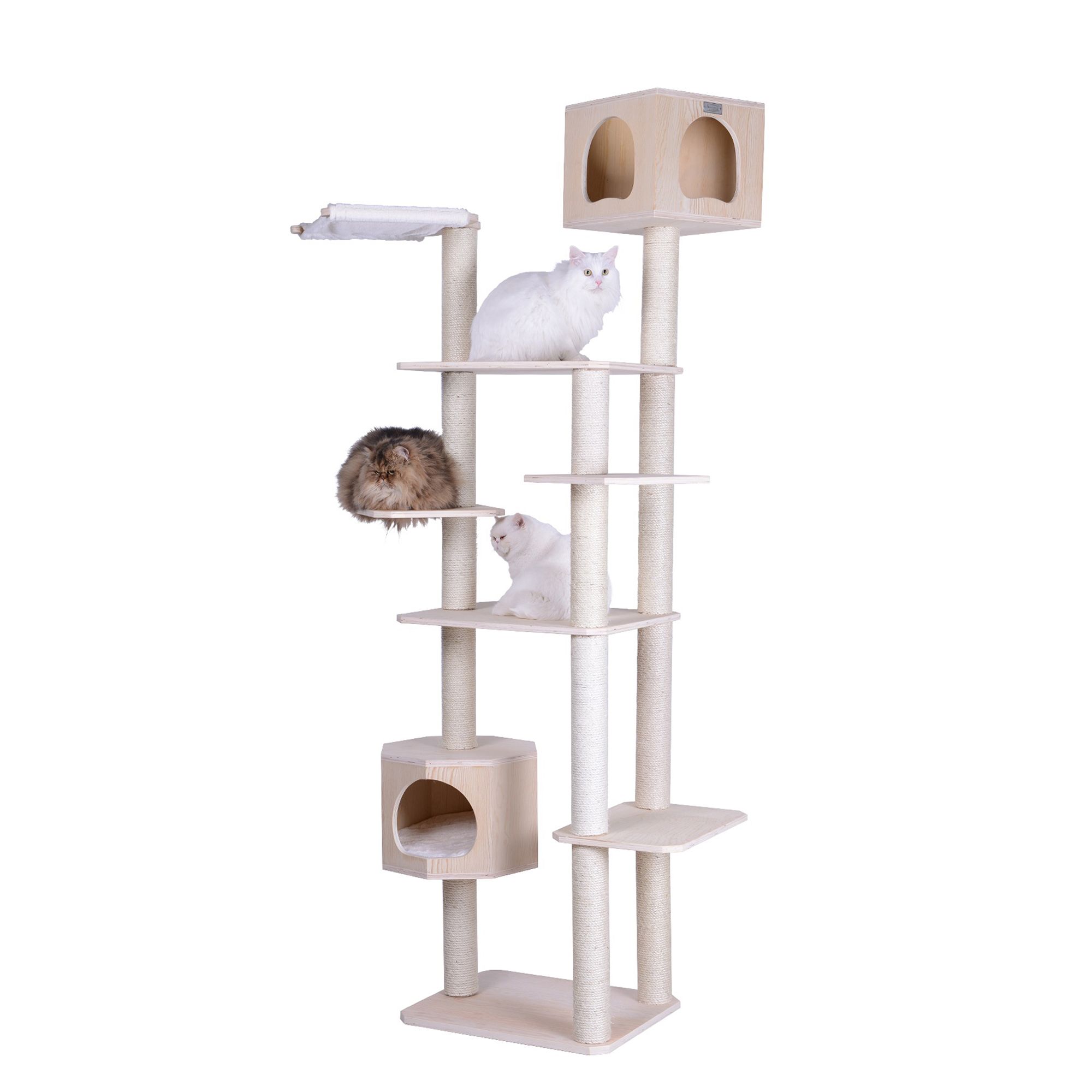 Multi-function Cat TowerEasy to clean and goes with furniture.Constructed of plywood veneers with original wood grain, polished surface, and natural Scots Pine scent.Features a lounge playhouse, big platform, plush hammock and sisal scratching posts for activity.Post Diameter: 3.5 in, Base Dimensions: 24 in x 23 in, Playhouse Dimensions: 14 in (L) x 14 in(W) x 12 in (H), Perch Dimensions: 18 in x 18 inMaximum Holding Weight: 70 lbs.180 Days Manufacturer Warranty.