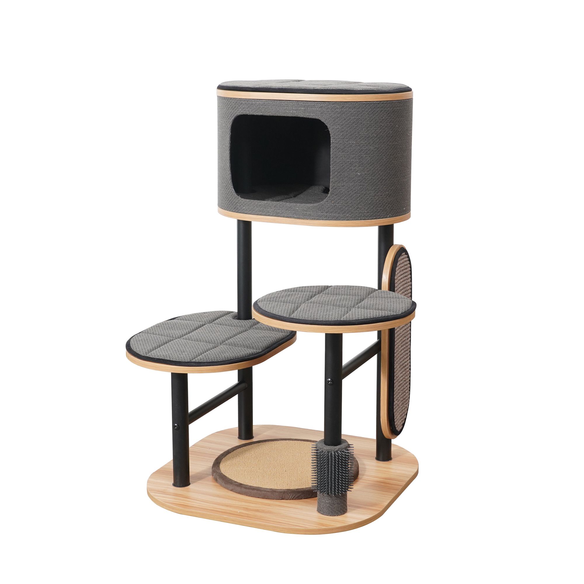 Introducing the Eclipse - a modern 2-level cat tower for apartment living. Wrapped in quilted velvet, it offers comfort and style with a cozy perch and secluded condo. Equipped with a teaser toy, rubber groomer, and a natural rope scratching post, it promotes play and grooming. Its compact, minimalist design blends seamlessly into modern decor, adding sophistication. Experience style and functionality with Eclipse, designed for discerning cats and their owners.