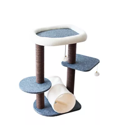 The Catry Lifted Modern Cat Tree is a multifunctional 4-level cat tree that combines a minimalistic and modern design to fit any home décor. This cat tree includes three felt-covered perches to provide your feline friend with comfortable spaces to climb and jump. Our lovely 4-level cat tree includes a soft top bed that will be the perfect cozy space for a nap or to lunge. Lifted includes a cozy, interactive plush tunnel best for all the comfort your feline friend needs. This modern cat tree features non-toxic recycled paper rope scratching posts to help keep your kitty's nails trimmed and healthy. Lifted also includes pom-pom toys for your feline friend to enjoy hours of playtime.