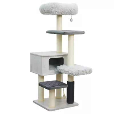 Introducing the Kasio - a sleek, multi-functional cat tree designed with laminated wood. Featuring six engaging levels for endless entertainment, it includes a teaser toy and rope for play. The spacious condo, adorned with a removable shag-fur cushion, offers a cozy retreat. With six natural sisal scratching posts and a soothing rubber groomer, it promotes healthy habits and well-being. Its stylish beige palette seamlessly blends into any decor, adding a modern touch to your home. The Kasio cat tree combines fashion and function, standing out as a statement piece of cat furniture for stylish owners. Experience the ultimate choice for your cat's comfort and enjoyment.