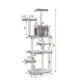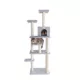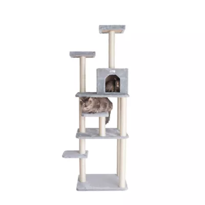Carpeted with faux fur, silver gray color.Multi-Level cat tree with sisal-covered Posts, 2 perches, playhouse for large cats.Each platform with a comfortable place for your cat to rest and relax. 100% natural, seasoned sisal rope wraps all posts securely for years of scratchability.Fabrics can be easily spot cleaned with soap and water to avoid stains.Overall: 30 in (L) x 29 in (W) x 74 in (H), Post Diameter: 3.25 in, Base: 23.5 in x 19.5 in x 0.6 in, Condo: 14.5 in (L) x 12.5 in (W) x 12 in (H), Perch: 14 in x 12 in x 2 inMaximum Holding Weight: 60 lbs.