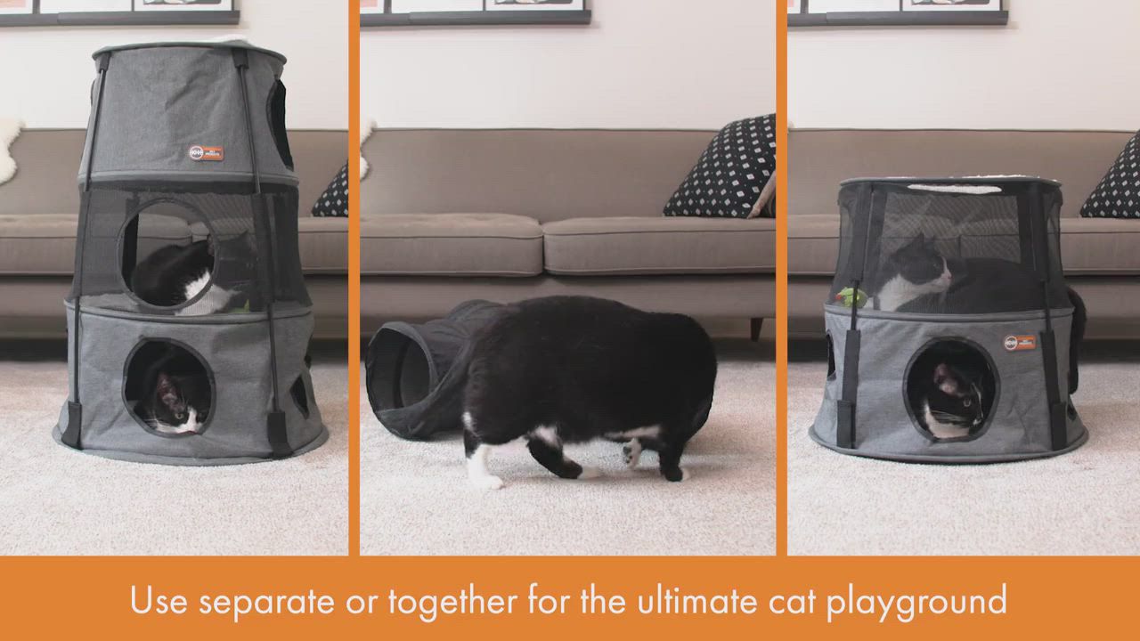 Features: 3 levels of fun with interior access for feline antics or a get–away snooze. Multiple entrances that are 7 inches wide to give even large cats access6 peep holes along the bottom and mesh center allow areas for constant surveillance. Lightweight, easy to move, sturdy design assembles and dissembles quickly with 4 fiberglass poles that secure in the sides. Levels are tiered slightly smaller as they go up for super stability. Super soft ultra–fleece sleeping surfaces on all levels. Gorgeous oxford fabric with vinyl backing will be durable for years.