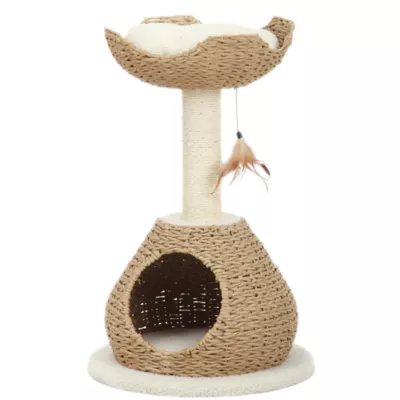 The PetPals Walk-Up 100% handwoven paper rope cat condo and perch with natural sisal rope scratching post. This boho-chic cat tree features a cozy condo for your cat to feel safe. Our stylish Walk-Up includes a top handwoven paper rope perch with a removable fleece cushion ideal for your curious cat to lounge. This unique cat tree features a natural sisal rope scratching post that will help keep your cat's nails trimmed and healthy. Walk-Up includes a fun feather toy for your kitty to enjoy hours of playtime. Not only your cat will love it, but you will too with its sleek design, in a tan and cream color, it will look great in any room of your home. Our brand's mission is to design and provide quality products to meet our customers' pet needs and to provide our customers with cat furniture that is home friendly.