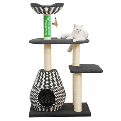 The PetPals Ace is a boho chic multi-activity handwoven cat tree. This lovely cat tree features 4 levels for your kitty to climb and burn some energy. Ace includes five 100% natural sisal rope scratching posts to help keep your feline friend's nails trimmed and healthy. This multi-activity cat tower features one handwoven paper rope cat condo that will be the perfect hiding spot or napping space for your kitty. Ace features a paper rope handwoven top perch bed with a removable cozy felt cushion ideal for your curious cat to lounge. It also comes with a fun feather toy for when your cat is feeling energetic. The beautiful black and white contemporary design will be the perfect addition to your home decor. This 4-level cat tree is large enough for more than one cat. Our brand's mission is to design and provide quality products to meet our customer's pet needs and to provide our customers with cat furniture that is home friendly.