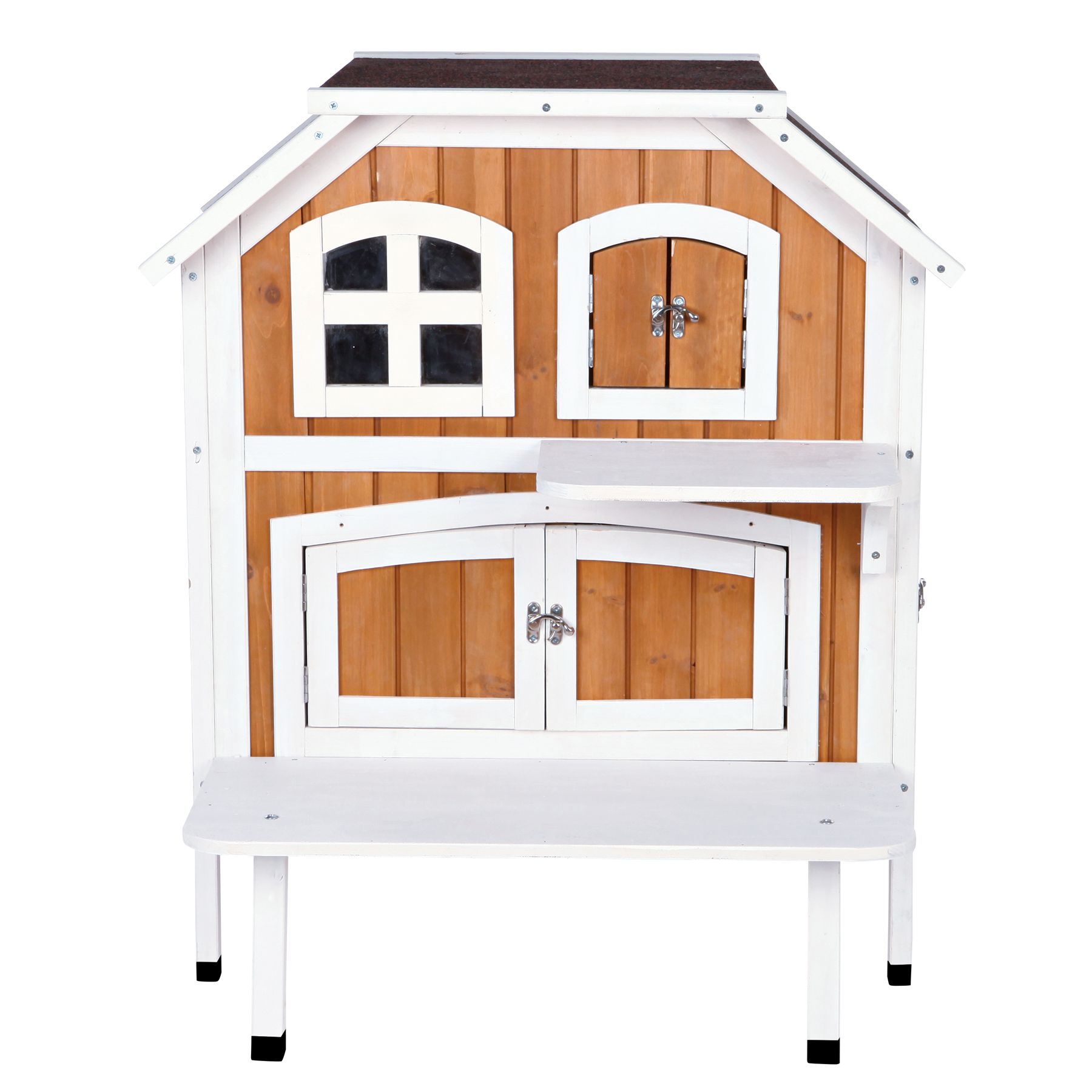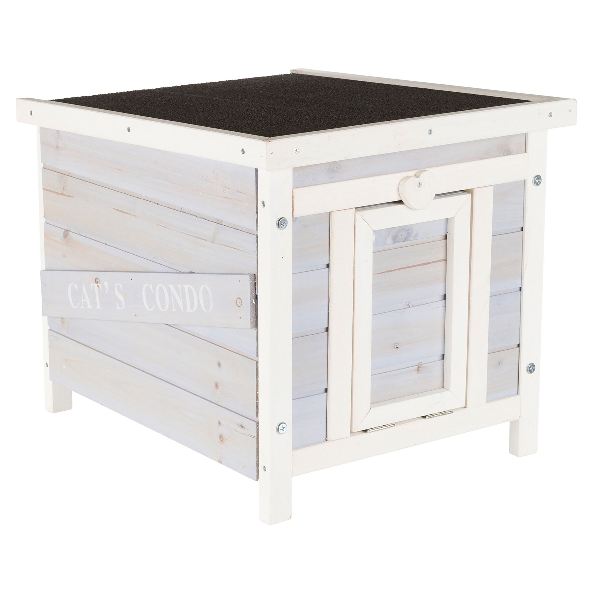 Give your kitty the hangout spot they never knew they needed with the TRIXIE Wooden Cat House! This durable indoor/outdoor cat house is constructed using natural, eco-friendly fir wood treated with a water-based stain. The TRIXIE Wooden Cat House is designed to protect your pet from the elements, and the plastic flaps shield against rain, wind, and snow. The raised floor keeps your cat's resting area dry and comfortable, while also providing adequate air circulation. The roof is covered with composite asphalt shingles that offer extra protection and durability. There is also a side door, making it convenient to access your cat, check on their well-being, and clean the house when necessary.