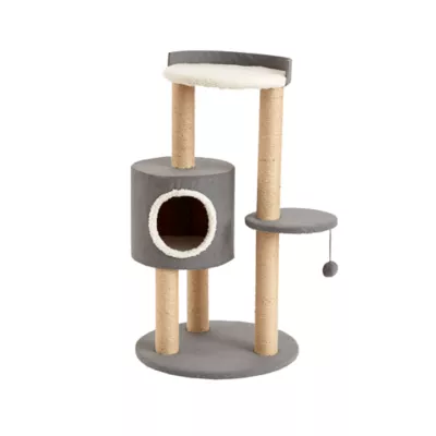 This Two by Two Oak 4-level cat tree with condo is perfect for cat napping, scratching, perching or playing. Its platforms give your cat a place to perch and play, while its jute-wrapped columns are great for scratching. Cozy condo attached. 39.4 inches tall x 21.3 inches wide. Easy assembly.