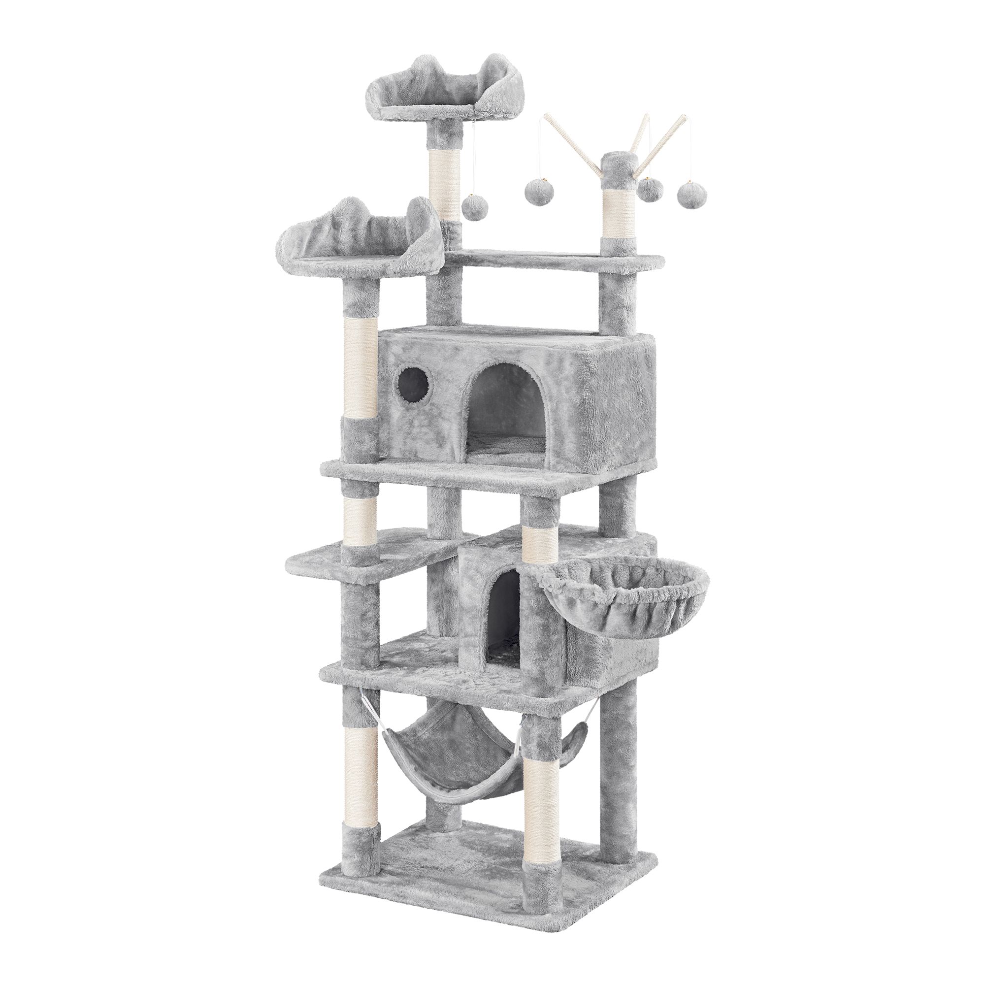 Description and Overview: This all–in–one cat tree, specially designed for your medium to large feline friends, combines entertainment with leisure. It features two padded perches with raised edges, two spacious condos, one soft hammock, two detachable dangling balls, a sisal twine, and six coiled sisal rope scratching posts. Constructed of CARB P2–compliant particleboard, natural sisal, and pet–friendly soft plush fabric covering, this cat furniture gives your cats a safe and comfy lounge. It can house 2–3 medium to large cats.