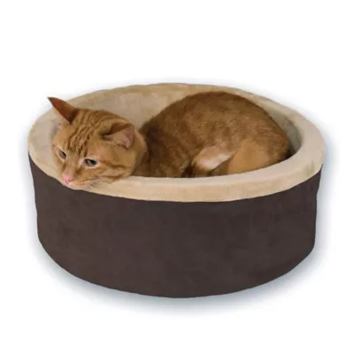 The K&H Thermo-Kitty Bed includes a dual thermostat, 4-watt heating unit buried within its thick premium polyfil pillow base. The internal thermostat warms the surface of this heated cat bed to about 10-15 degrees above ambient air temperature when not in use. When not in use the bed may not feel warm to your touch, but your pet can sense the heat coming from the bed. Once your pet lies in the bed it warms to your pet's normal body temperature to keep them cozy warm. The heater is removable and the cover is machine washable. Available in multiple sizes and colors. Indoor household use only, MET Safety Listed, one-year warranty. TIP: To test your K&H Thermo-Kitty Bed simply place a pillow or book in the center of the bed. After 15 minutes feel the surface of the bed, it will be warm, not hot. Remember, the surface of this heated pet bed will not feel warm to the touch until your pet is in the bed.