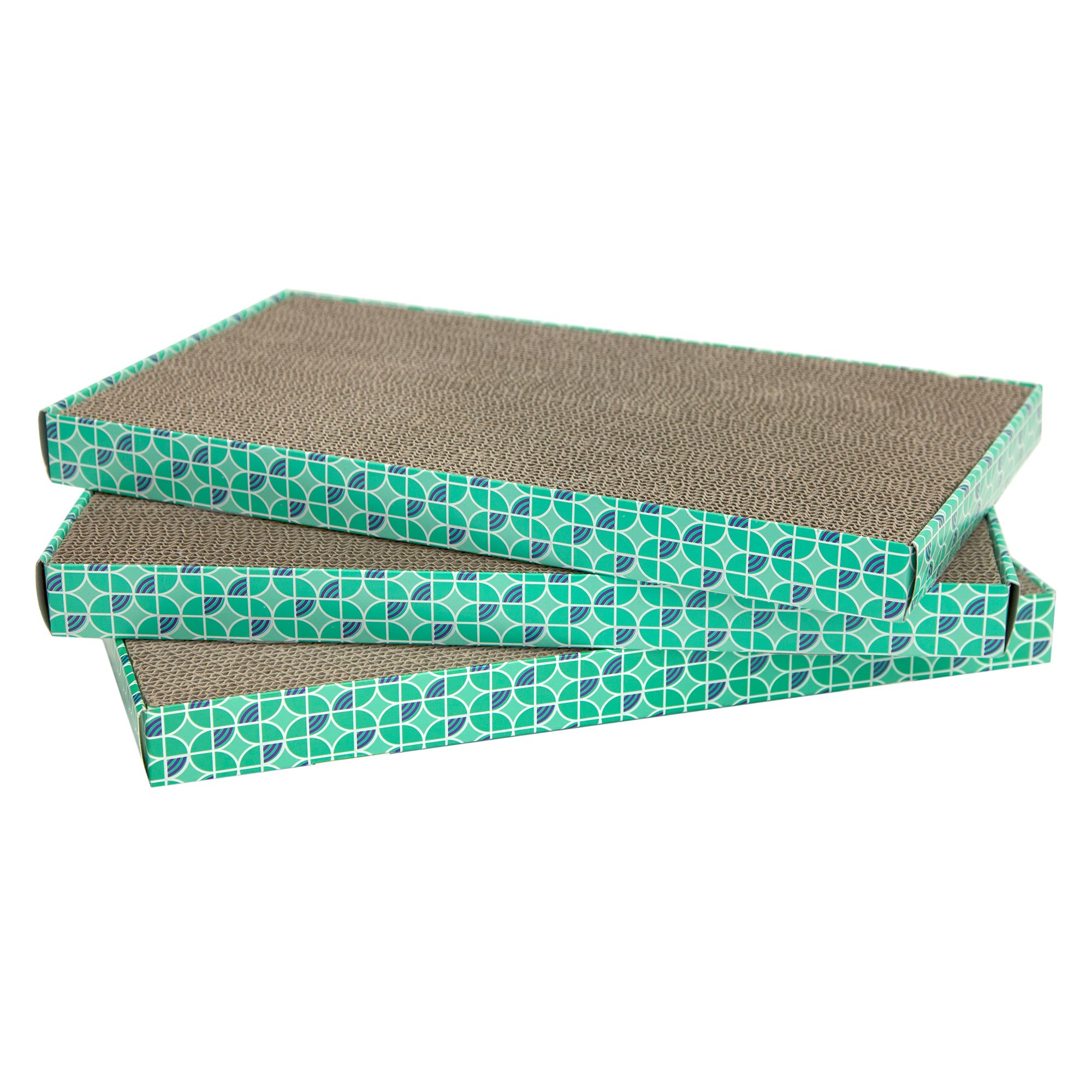• Scratchable recycled corrugate trims cats' nails while they lounge and scratch