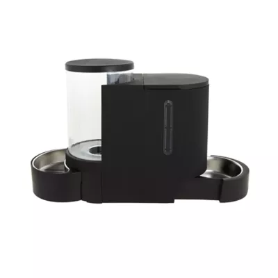 GRAVITY FLOW DESIGN: Food and water are gradually refilled as your cat eats and drinks.EASY TO CLEAN: Removable stainless-steel bowls separate from tray for easy cleaning.STAINLESS STEEL BOWLS: Non-porous and hygienic material that discourages bacteria.FOOD-GRADE PLASTIC BOTTLE: Sturdy, lightweight PET plastic is shatter-resistant and safe for food storage. FEEDER WINDOW: The transparent window makes it easy to keep an eye on kibble supply before your cat comes calling.NO POWER NEEDED: Zip. Zilch. Nada. We've cut the cord so you can set up this snack & hydration station anywhere.BPA Free