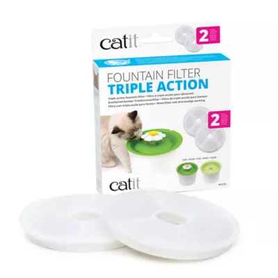The Catit Triple Action Fountain Filters are designed to help remove odors, impurities and filter out debris from the cat water bowl. The ion exchange resin helps soften minerals like magnesium and calcium in tap water. The active carbon removes odors and impurities. The mesh material is also great at capturing large debris, which keeps the water and the fountain clean. Catit Triple Action filters are guaranteed to safely and optimally purify your cat's drinking water for approximately 30 days. After that time, filtration effects will start to gradually decrease and bacteria may start to form within the fountain reservoir. Replace your Catit Triple Action Filter every month, or sooner, if the filter is visibly saturated.
