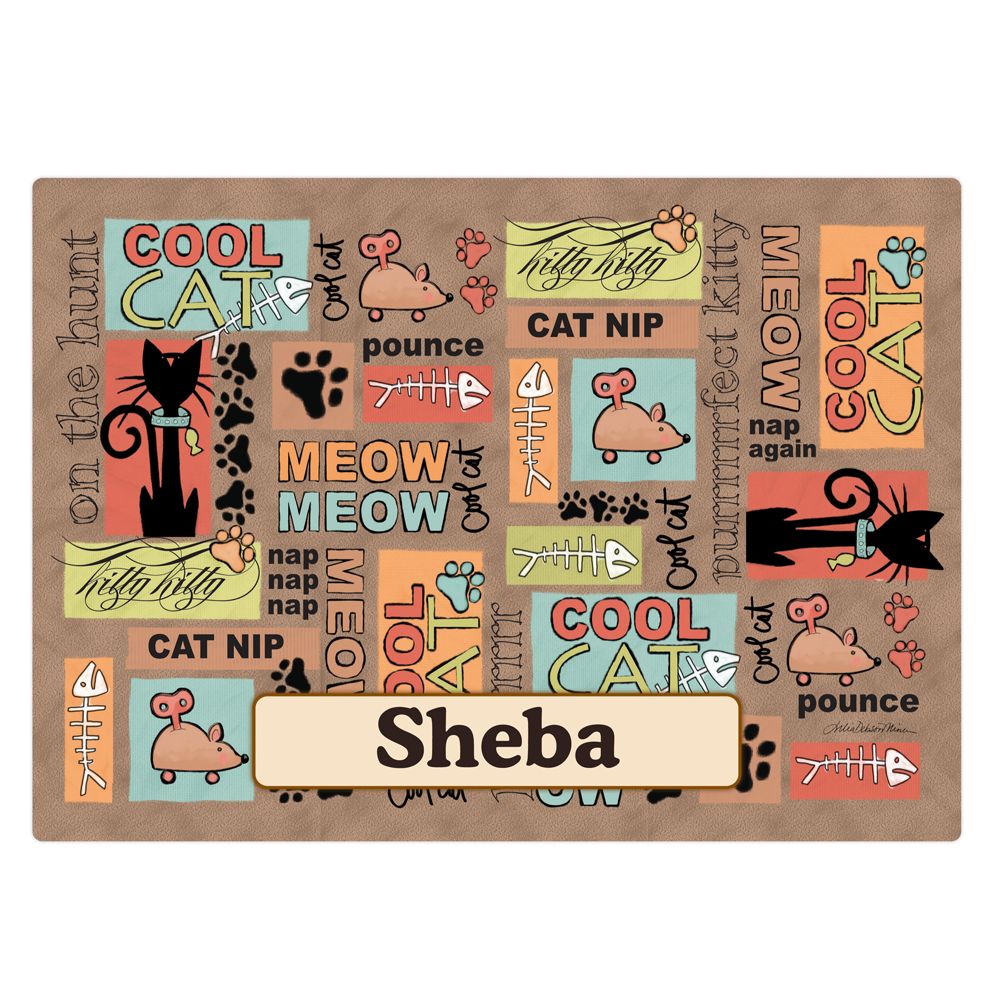 Please Note: Personalized items may only include alphanumeric characters. This Drymate Kitty with Fish Waterproof Personalized Cat Mat features Zorb-Tech anti-flow absorbency technology (absorbent, yet waterproof). Soft, stain resistant, felt-like fabric is coated on one side with a clear, durable, special bonded backing that prevents soak-thru.