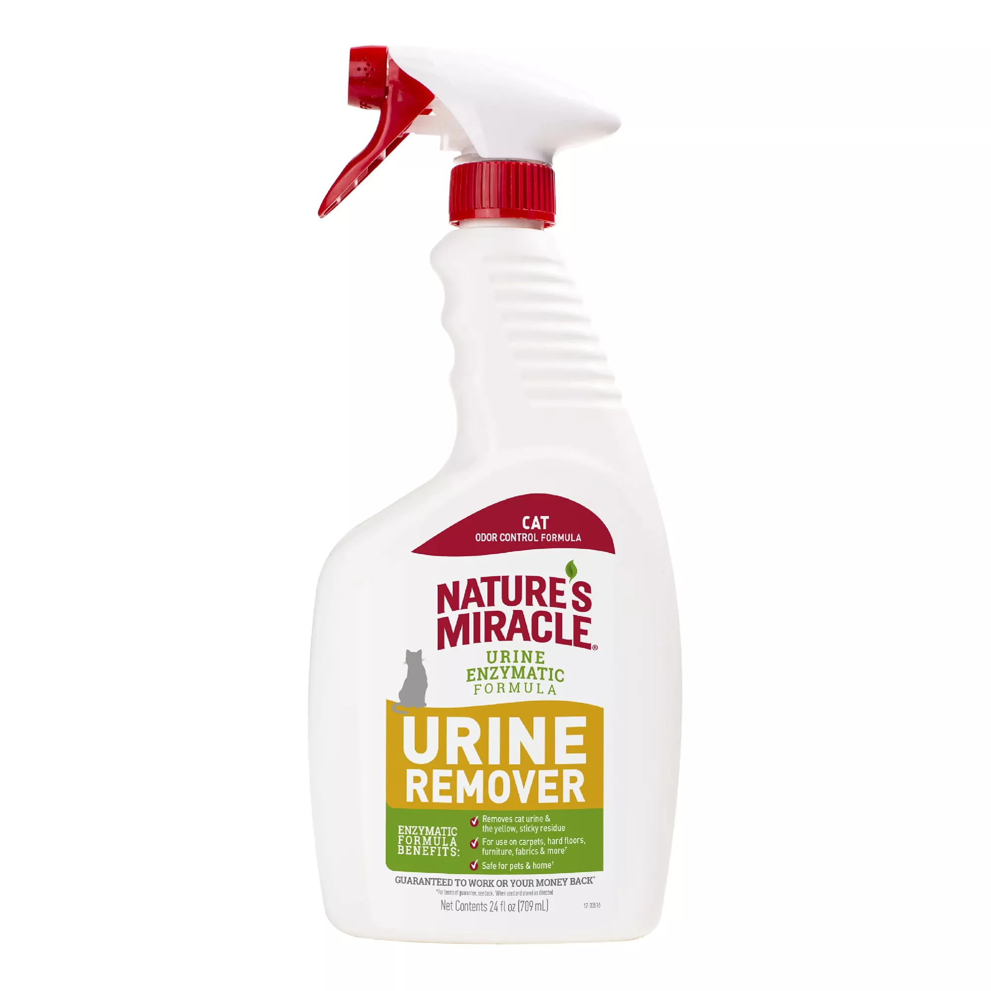 At PetSmart, we carry top products for cleaning up pet accidents, including cat spraying or marking and odors from the litter box, which can be especially helpful for families with multiple cats. We also carry large bottles for some of your favorite cleaning solutions. You'll find air fresheners, carpet cleaning solutions, and spot sprays and foams with applicator brushes to attack the soiled area directly. With our cat stain and odor removers, including some with specialized enzymes to neutralize cat urine, you can help your cat learn where to go. Cat urine removers often contain enzymatic formulas that react on contact with pet waste, including urine and vomit, to break them down and completely remove odors and stains, leaving only a fresh scent behind.