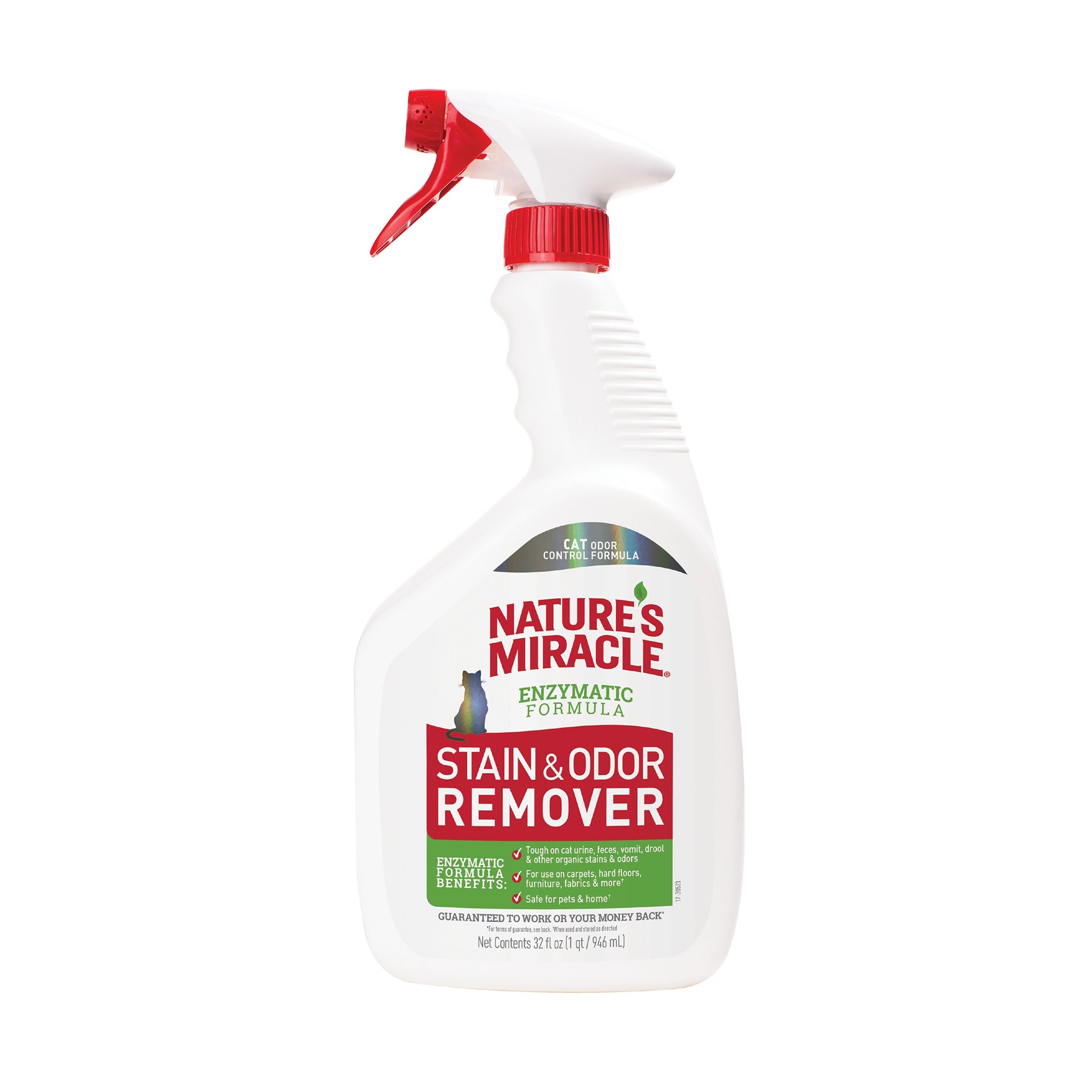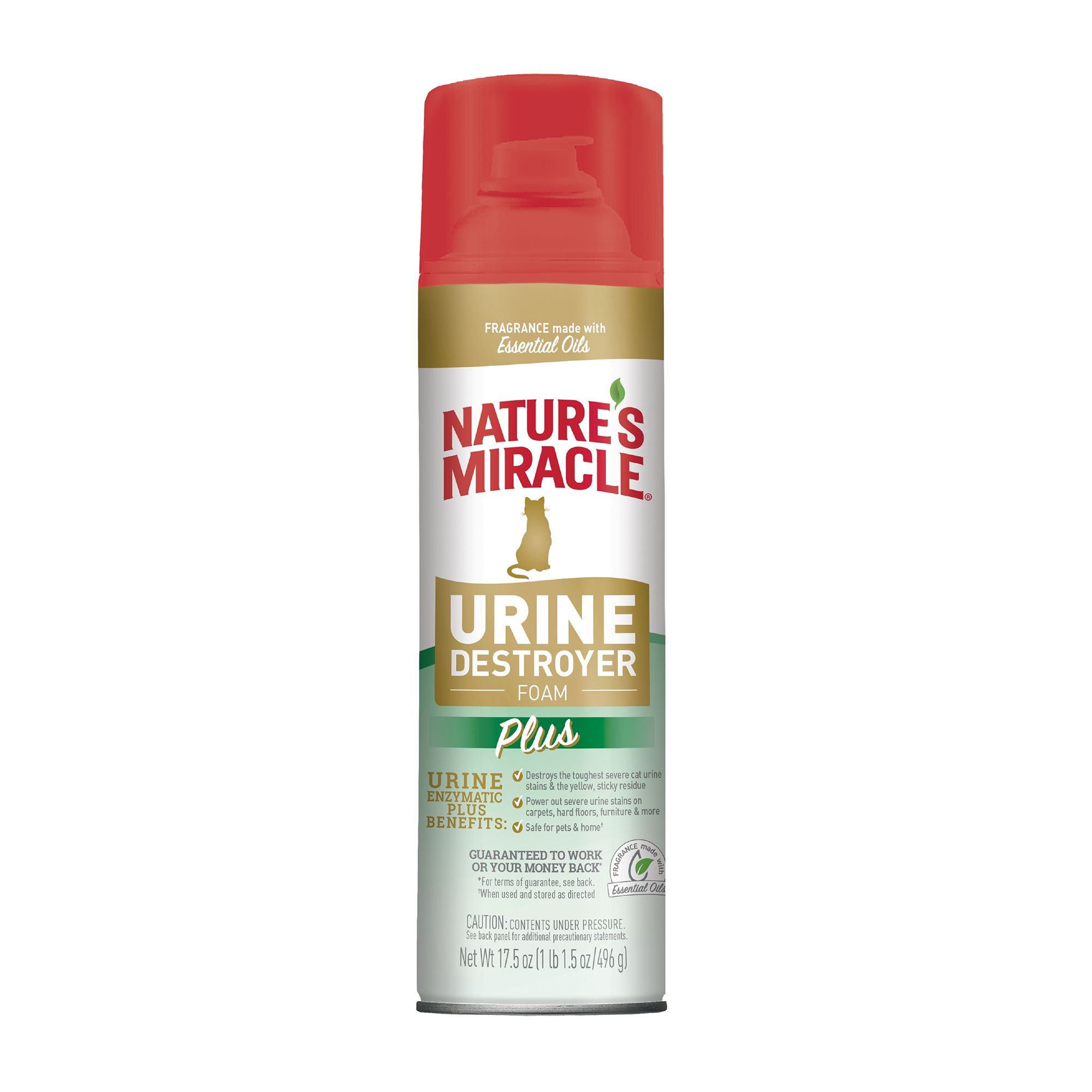 Nature's Miracle Urine Destroyer Plus for cats is an enzymatic formula that's tough on strong cat urine and the yellow, sticky residue it leaves behind. The ready-to-use spray bottle makes cleanup a breeze. The bacteria-based formula produces enzymes when it comes into contact with a food source like pet urine. This enzymatic cleaner continues working as long as the food source is present to break down and power out tough messes.