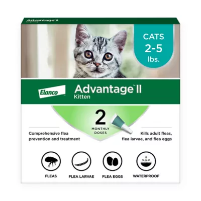 Advantage II Kitten is a vet-recommended, leading brand in cat flea protection. Advantage II Kitten flea treatment and prevention kills adult fleas, flea larvae and flea eggs to deliver total flea protection to your kitten. Within 12 hours of application, Advantage II Kitten topical treatment gets straight to work killing fleas through contact, so they don't have to bite your kitten to die. This treatment works hard for 30 days following application, effectively breaking the flea life cycle, controlling existing flea infestations and preventing further infestations all month long. Fleas not only cause discomfort; they can also pose other risks. Monthly use of Advantage II Kitten is important to protect your kitten against fleas that may cause transmission of tapeworms, Flea Allergy Dermatitis and flea bite anemia. That's why Advantage II Kitten makes applying treatment simple. This convenient, topical, spot-on application goes on the back of your kitten's neck at the base of the skull. You'll simply place the tip of the tube on the skin and squeeze the tube to expel the entire contents directly on the skin. It goes on in seconds! It's easier than a flea collar and there are no hard-to-swallow pills. You'll also love that Advantage II Kitten is fragrance-free and waterproof after 24 hours of application. Check the product label for information on application and potential side effects. Advantage II Kitten flea protection is effective on both indoor and outdoor cats. Your kitten should be at least 8 weeks old and weigh between 2 and 5 lbs. to use Advantage II Kitten. For the ultimate convenience in care, Advantage II Kitten is available over the counter - no prescription needed. And, you can stock up with a subscription for regular doorstep deliveries so you never miss a monthly treatment. Advantage II Kitten is a trademark of Elanco or its affiliates.