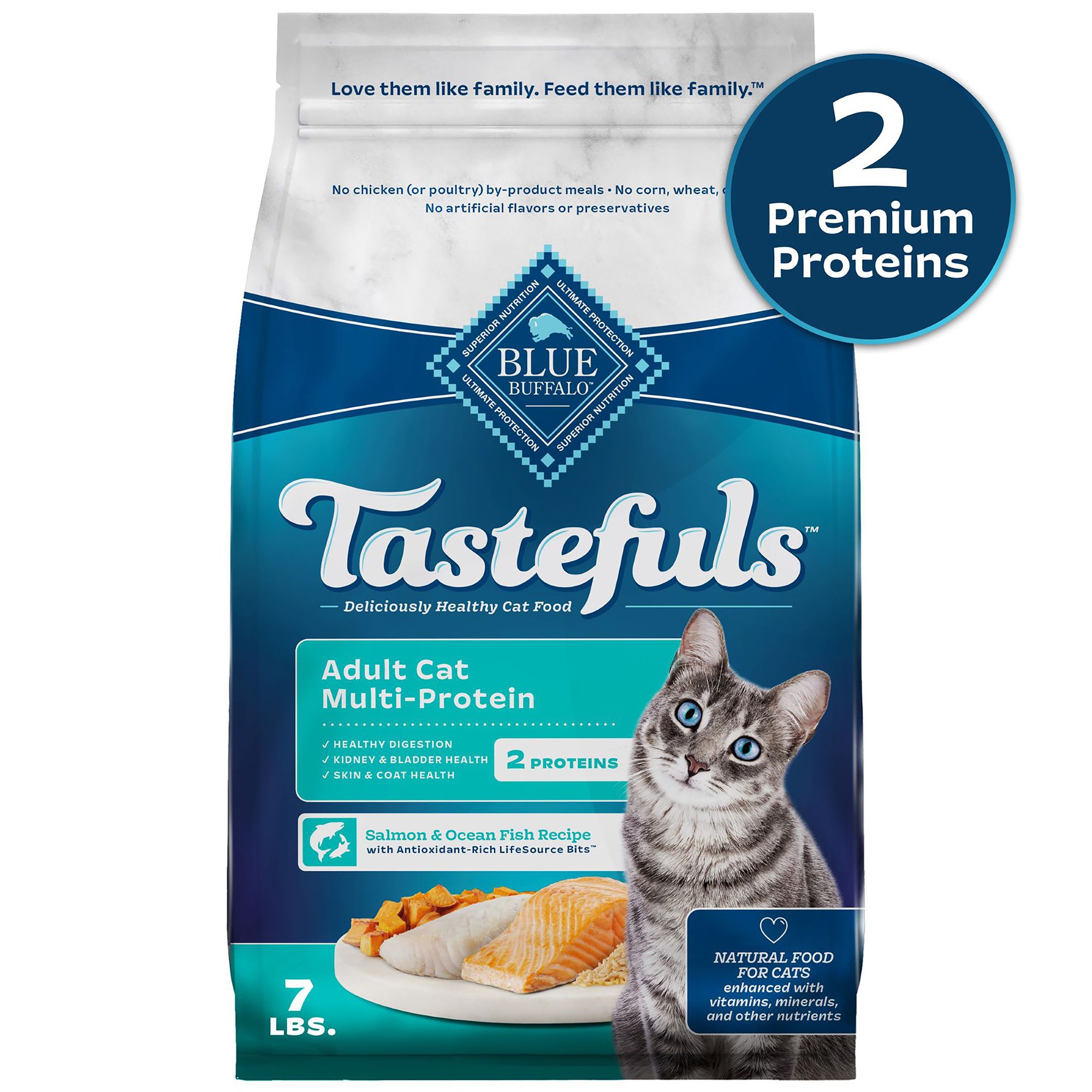 Description: Blue Buffalo Tastefuls Multi-Protein Recipe Adult Cat Dry Food is an innovative formula starting with two premium proteins for flavor variety that keeps cats coming back for more. This deliciously healthy recipe blends real, high-quality chicken and turkey for an irresistible taste to satisfy even the most particular palate. Made from natural ingredients you'll both love, enhanced with vitamins, minerals, and other nutrients, Tastefuls Multi-Protein recipes deliver the taste that cats crave and the quality Pet Parents demand. BLUE Tastefuls Multi-Protein recipes provide balanced nutrition for adult cats with high-quality proteins, healthy complex carbohydrates, and nutritious fruits and vegetables. Plus, BLUE Tastefuls contains our exclusive LifeSource Bits, a precise blend of antioxidants, vitamins, and minerals to support immune system health and a healthy oxidative balance for your cat. BLUE Tastefuls is backed by the True BLUE Promise and always starts with real meat, poultry, or fish. It contains no chicken or poultry by-product meals, no corn, wheat, or soy, and no artificial flavors or preservatives. Love them like family. Feed them like family.