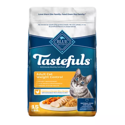 Blue Buffalo Tastefuls Adult Weight Control Cat Food is a delicious dry cat food formulated with real chicken as the first ingredient. A great choice for cat parents who want to prioritize natural ingredients while pleasing picky palates, this Blue Buffalo dry cat food is formulated without any chicken (or poultry) by-product meals, and it is free of corn, wheat, soy, and artificial flavors and preservatives. BLUE Tastefuls cat food is packed with naturally tasty ingredients and key nutrients like L-Carnitine to support natural weight management and lean muscle development, plus fiber to help your cat feel full. This natural cat food will keep your cat purring for more!