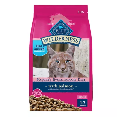 BLUE Wilderness Natural Cat Food is a great choice for Pet Parents looking to satisfy their cat's natural cravings. This protein-rich dry cat food for adult cats is packed with real salmon to help build strong muscles, plus natural sources of fiber to help provide optimal nutrient absorption and digestive health. What's more, this grain-free cat food features an optimal balance of Omega 3 and 6 fatty acids to help promote a shiny coat and healthy skin. Like all Blue Buffalo cat food, BLUE Wilderness natural cat food contains no chicken (or poultry) by-product meals. It's also free of corn, wheat, soy, artificial flavors, and preservatives.
