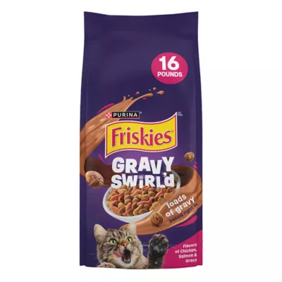 Bring the deliciousness of gravy mixed with two cat-favorite flavors to your cat's dish with Purina Friskies Gravy Swirl'd cat kibble. Savory chicken and salmon cat food flavors combine to create the taste cats crave, and there's gravy baked into each crunchy bite for added yum. Let the sound of the mouthwatering adult cat food kibble hitting her bowl pique your cat's attention and watch as she delights in every last delicious bite. This Friskies cat food recipe features essential vitamins and minerals for the everyday nutrition your cat needs to be her best self. Because it's formulated for all life stages, this mouthwatering Friskies dry cat food meal can follow your cat companion from her playful kitten days all the way through her adventurous adult years. Give your cat the 100 percent complete and balanced nutrition she deserves, along with the taste she adores every time you offer up a helping of this Purina Friskies cat food recipe.