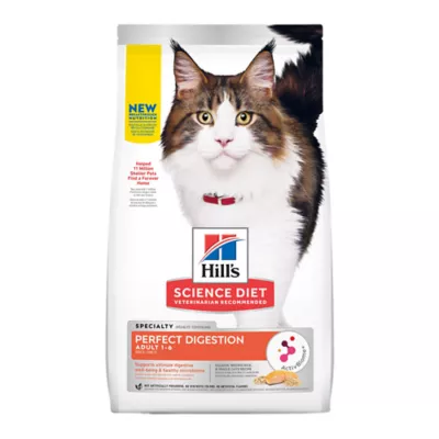 Hill's Science Diet Adult Perfect Digestion Salmon, Dry Cat Food contains ActivBiome+, an exclusive blend of prebiotics, & whole grain oats and pumpkin. This delicious food provides balanced nutrition for overall wellness to help your pet feel their best, and helps your pet's body absorb and use vital nutrients. It includes high-quality protein from salmon to help maintain lean muscles, as well as essential taurine for heart health & balanced minerals to support the kidneys and the bladder.